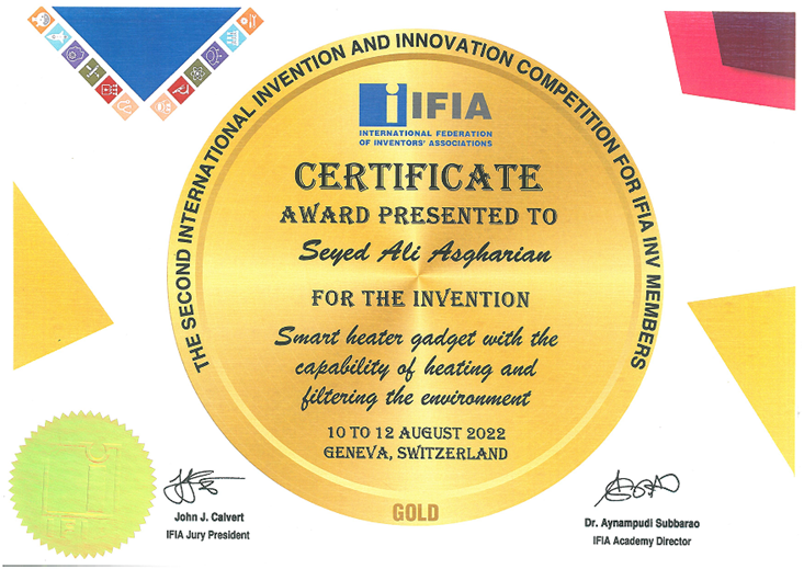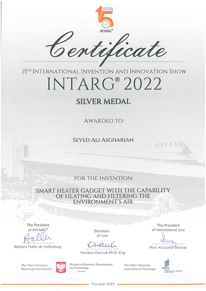 طرح و ایده بنده در مسابقات اختراعات کاتوویتس ۲۰۲۲ موفق به کسب مدال نقره شد . این مسابقات با همکاری سازمان جهانی مخترعین ، سازمان مالکیت معنوی بین المللی WIPO برگزار و این نتیجه افتخارآمیز برای کشورم به ثمر نشست . البته شایان ذکر است که ایده بنده در مسابقات اختراعات 2022 سوییس ویژه مخترعین ، نیز توانسته بود مدال طلای این مسابقات را از آن خود کند .